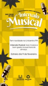 Sintonize a Unicentro Entre Rios FM e acompanhe a estreia do Intervalo Musical, dia 9 de fevereiro, a partir das 12h30.