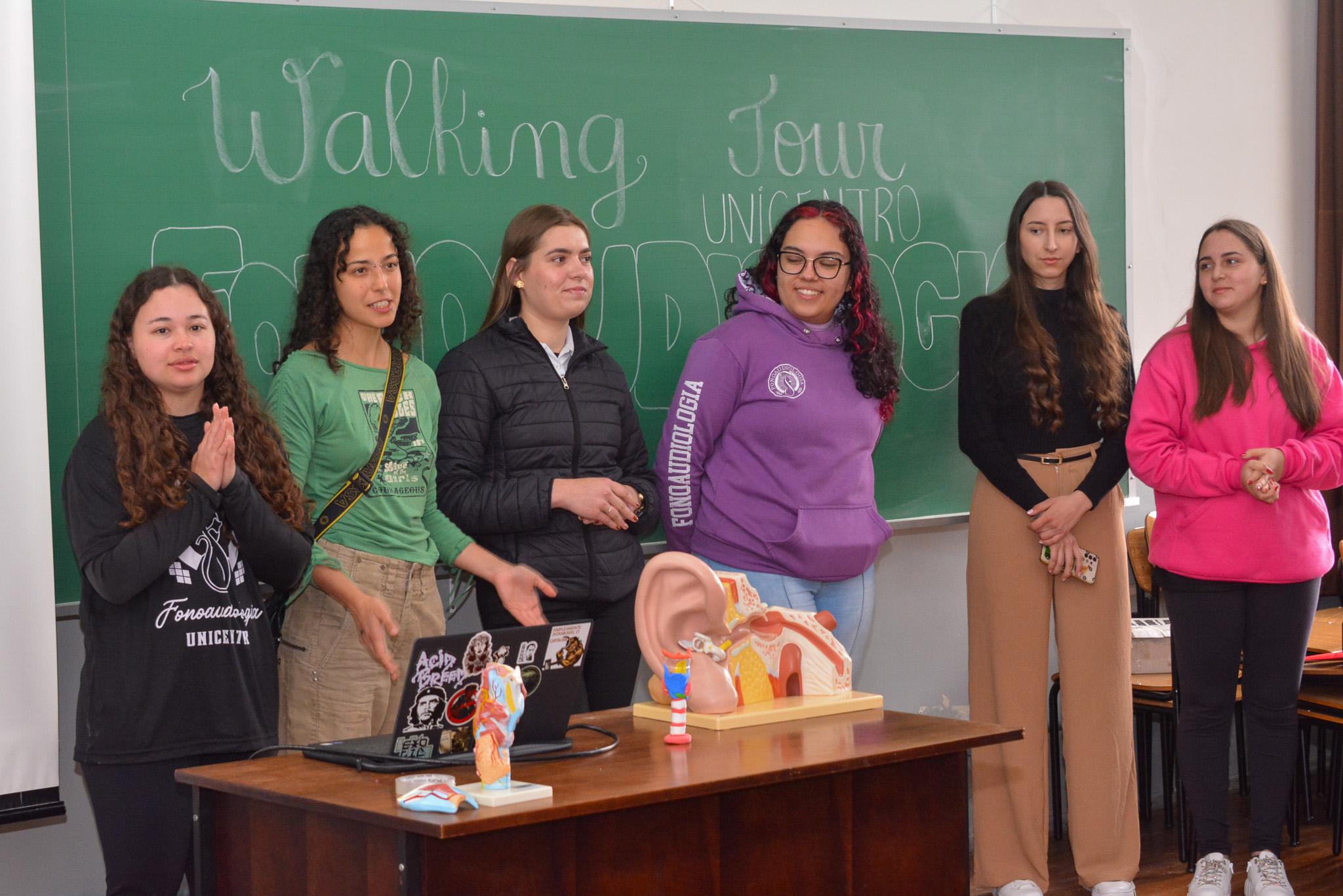 A professora Mariléia Gartner, do Departamento de Letras, reforça o protagonismo discente nas apresentações durante o Walking Tour. “Nós contamos com a participação dos nossos estudantes, que fizeram toda a organização dos corredores, das salas, com muita literatura e muita linguística, trazendo um pouquinho da essência dos nossos cursos de Letras Português, Inglês, Libras e Espanhol”, descreve a docente.
