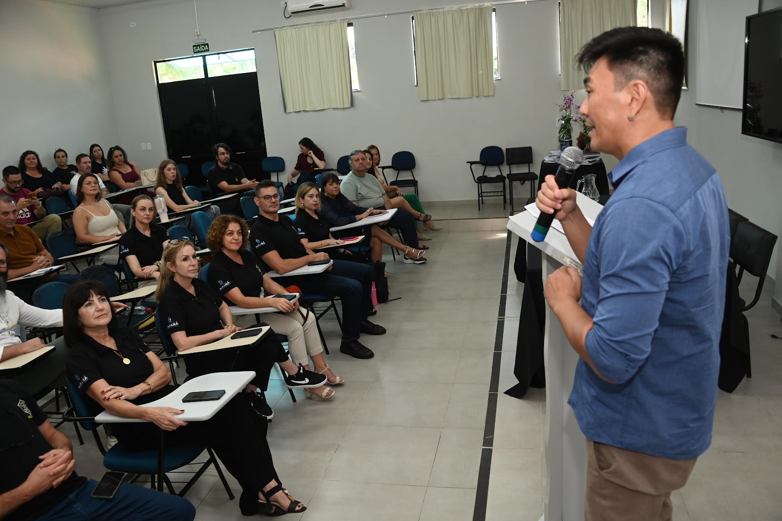 Já no período da tarde, a programação contou com a aula inaugural ministrada por um pesquisador da Universidade Tecnológica Federal do Paraná (UTFPR) e bolsista de produtividade da Fundação Araucária. A palestra abordou o tema “Uso de tecnologias na educação matemática” e discutiu o papel dos produtos educacionais nos cursos de mestrado e doutorado profissional. Durante a apresentação, o pesquisador destacou as diferenças entre os produtos educacionais desenvolvidos no mestrado e no doutorado, utilizando como exemplo uma proposta relacionada ao uso da inteligência artificial no ensino.